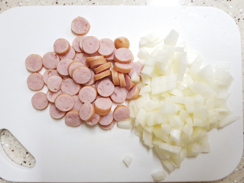 양파 1/2개는 잘게 자르고 소시지도 동글동글 잘라요.
